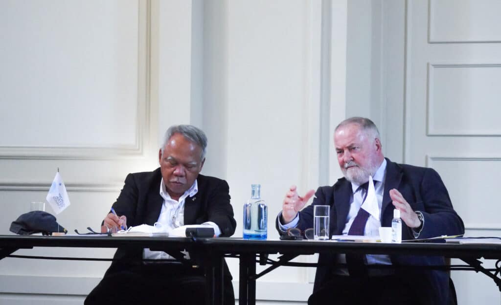 S.E. M. Basuki Hadimuljono, Ministre des Travaux Publics et du Logement et Loïc Fauchon à la réunion de travail pour la préparation du 10ème Forum Mondial de l'Eau à Bali.